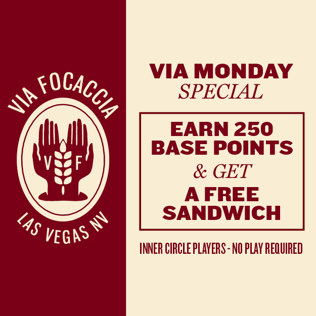 Start your week with a taste of our homemade focaccia! Every Monday: Earn 250 Base Points and get a FREE sandwich from Via Focaccia. Inner Circle Players - No play required! Management reserves all rights.