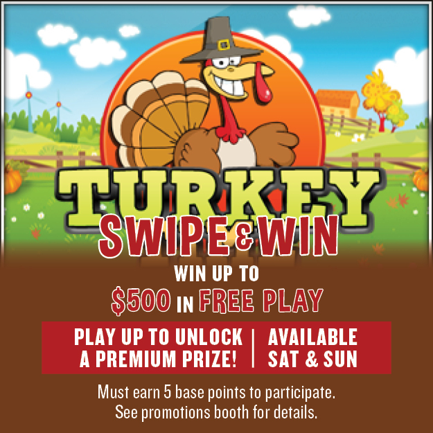 Swipe & Win up to $500 in Free Play every Saturday & Sunday! Play up to unlock a premium prize—must earn 5 base points to participate. See the promotions booth for full details.