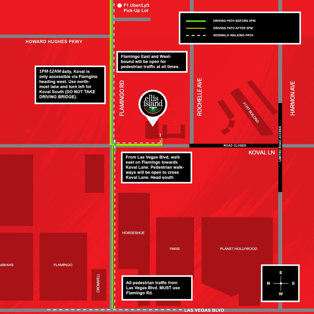 here. Before 1:00 PM on race days, vehicles may access Ellis Island eastbound and westbound on Flamingo Road. After 1:00 PM, vehicle access is limited to Koval Lane heading westbound on Flamingo Road. There will be no eastbound travel from I-15 or Las Vegas Blvd during hot track. Please see map below.